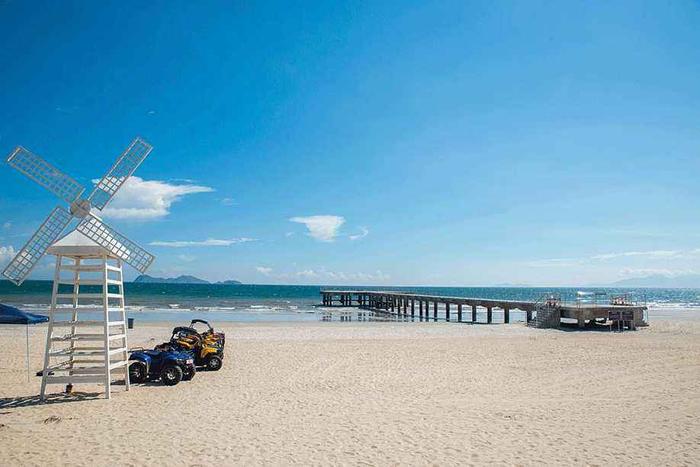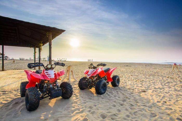 烈日下,沙滩呈银白色,沙质极其晶莹幼细,在这里你可以赤足踩上柔软的沙子,也可以尽情奔跑踏浪与大海亲密接触。我想这就是为什么沙滩团建活动这么受欢迎的原因吧!